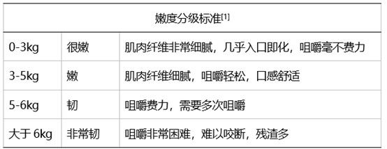 嫩度测定最著名和权威的方法是Warner-Bratzler   Shear Force。使用一个带有V形刀片的仪器,模拟人的牙齿切割肌肉纤维,测量切断一块标准大小的熟肉样本所需的最大力,力值越小,代表肉越嫩。