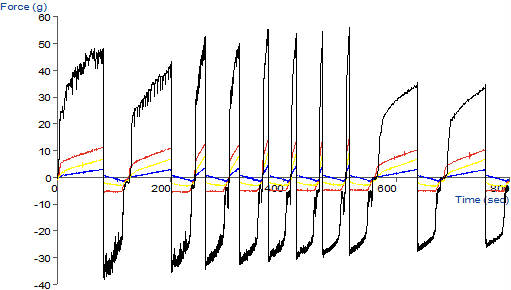 實驗方法 | 攪拌速度會影響聚合反應和乳液性能,當攪拌速度較慢時乳化劑對單體的乳化程度降低,不能很好地包覆乳液粒子使其分層;當攪拌速度過快時,乳液粒子數目減少,徑增大,聚合反應速率降低,易產生凝膠。此測試使用SMS的多態流變裝置進行測試,實驗會先對樣品進行2次預攪拌,排除樣品不均一干擾後,再執行五次變速攪拌,依序為10mm/s、40mm/s、80mm/s、120mm/s 、20mm/s各進行兩次旋轉攪拌,測得剪切係數,內聚係數及流動穩定性,藉以評估乳液流動阻力、 | |||