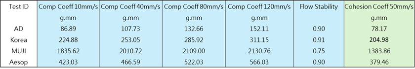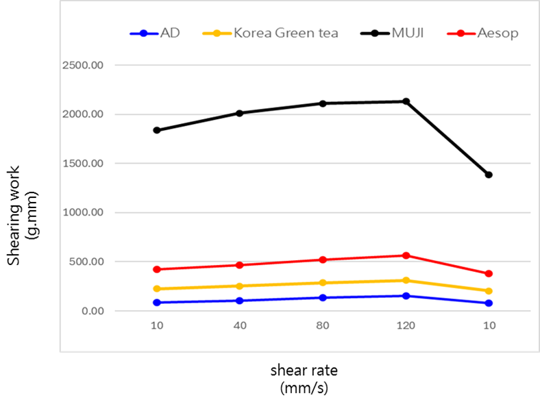 實驗結論 | MUJI有較高的塑形力,剪切稀化最為明顯,依序為Aesop、AD、Korea,其中Korea初始粘度最低且經過不同速度攪拌後質地狀態最為穩定,而AD流動性較佳,整體剪切穩定性趨勢與初始粘性呈正相關。 |