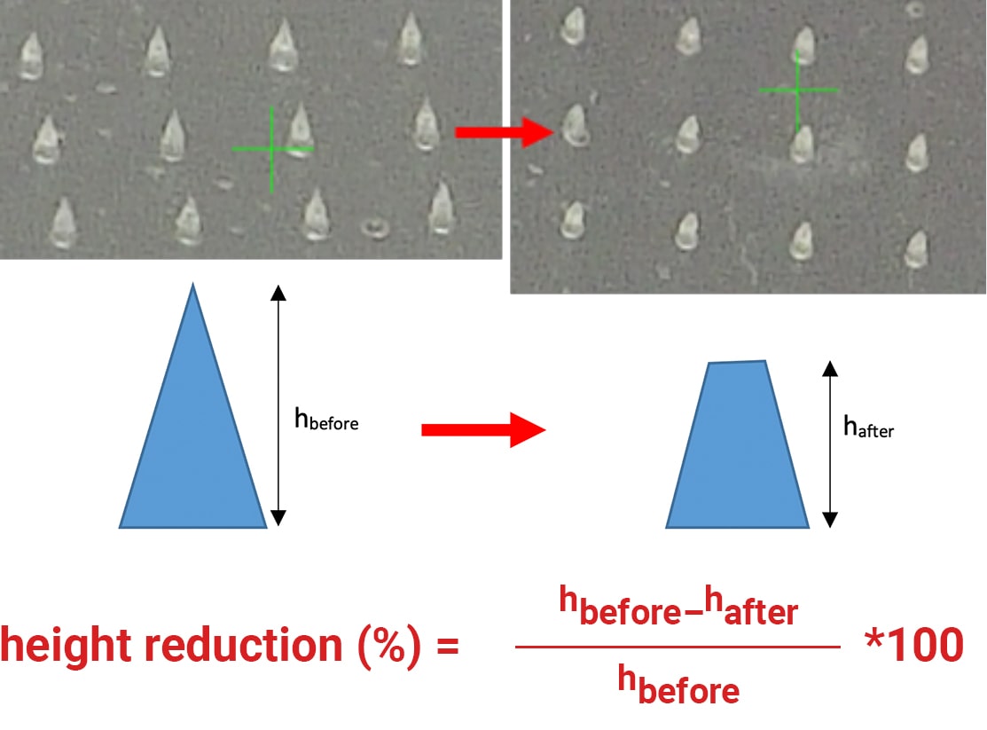 l 將陣列壓縮到已知軟基底(如動物皮膚或合成類似物)中,評估每個陣列所需的穿透力。 l 測量人體對軟基板上的陣列施加的力,通常在質地分析儀的校準平臺上進行。 l 使用拉伸試驗測量陣列背襯材料的特性。 l 以已知的力將陣列壓縮到硬基片中。針強度是陣列的一個重要特性。針頭應足夠堅固,能夠插入皮膚而不會發生故障。針剛度可從力-位移圖中測量,並且在某些情況下,極限強度可以作為圖上的斷裂點來測量。最常見的是,微針高度因彎曲或鈍化而發生的百分比變化通過校準光學或電子顯微鏡中的測量進行評估。將針頭壓入金屬底座與將針頭插入皮膚是完全不同的方法。該測試僅用於比較不同批次的陣列並確認製造的一致性,或評估不同製造工藝對針強度的影響。 |