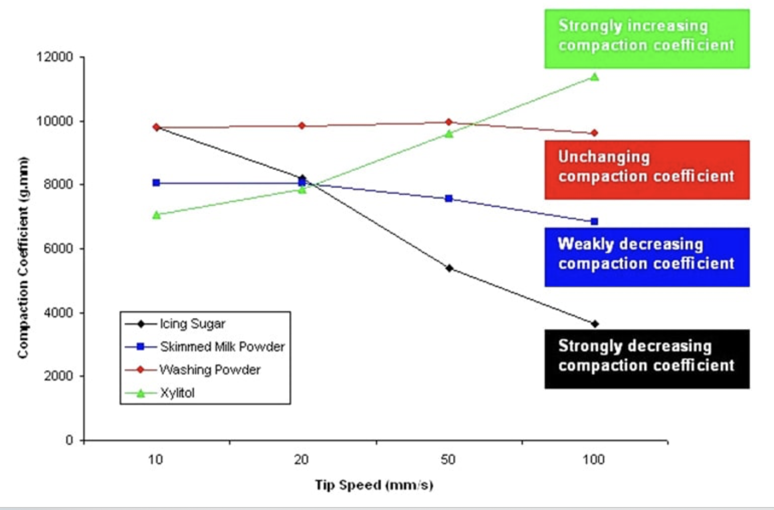 Erciyes 大學的研究人員還一直在研究蔗糖還原和澱粉類型對即食粉末甜點的體積和粉末特性的影響。 Zagreb大學的科學家們一直在研究泡沫墊乾燥過程的優化,以生產富含薄荷提取物的可哥粉。 PFSD 粉末流動特性可能隨著流速的增加或降低而改變。例如,粉末可能會因為被迫流動得更快而變得更難流動,或者隨著流速的增加它可能變得更加自由流動。由於工藝變更以滿足增加的產量需求,這個問題可能導致填充不足。粉體流動分析儀通過評估刀片在粉末中以增加的速度移動所需的功來測量該特性。 粉末流動穩定性的評估是通過比較在測試開始時將刀片移動通過粉末所需的功(壓實係數)與在測試結束時以相同速度移動粉末所需的功進行比較。自由流動的粉末將通過粉末柱向下或向上傳遞很小的阻力。相反,流動性差的粉末在任一方向上都表現出相當大的力。 |