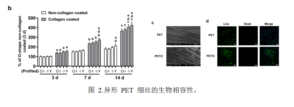 | 采用熔融纺丝技术制造了O、I、Y、+(十字)四种异形截面PET纤维其中Y型截面纤维结合胶原涂层(PET/C) 展现出最佳的细胞增殖(图2b)和粘附能力(图2c, d),为细胞提供了更大的接触面积和利于营养物质传输的毛细结构。