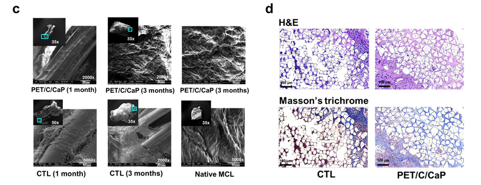 | 在兔子膝内侧副韧带(MCL)加固重建模型中,植入3个月后,新型 PET/C/CaP 韧带组韧带化程度高,结构接近天然韧带,纤维间隙细胞及胶原基质更丰富(图4);骨隧道内骨表面密度和体积密度显著高于对照组(LARS®)(图5b-c);移植物最大拉出失效载荷达68 N,显著高于对照组的48.67 N(图5d)。 |