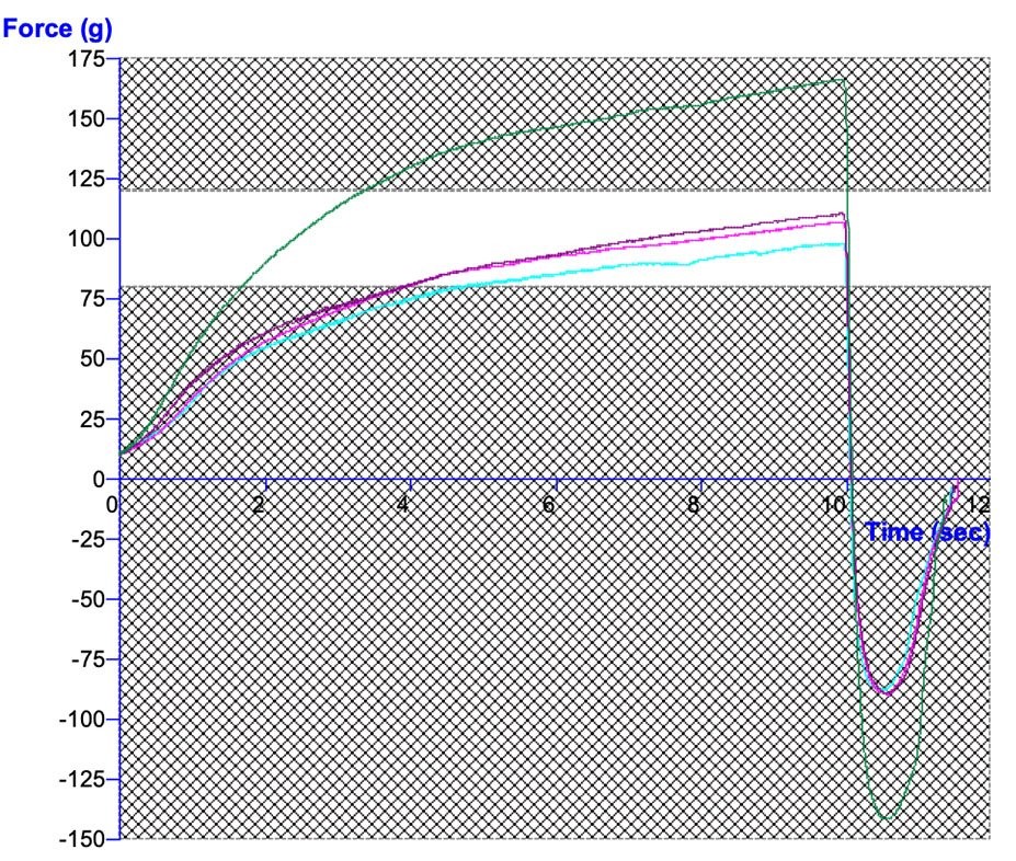 为您的理想质地创建产品验收带/区域,以衡量未来的产品批次。以这种方式查看数据可能会帮助您快速注意到哪些是可接受的质量,哪些是不可接受的。您也可以使用它来测试竞争产品,看看它们在质地上如何与您自己的黄金标准质地相对比如何。 要了解如何在 Exponent Connect 中进行设置,请观看此视频。 |