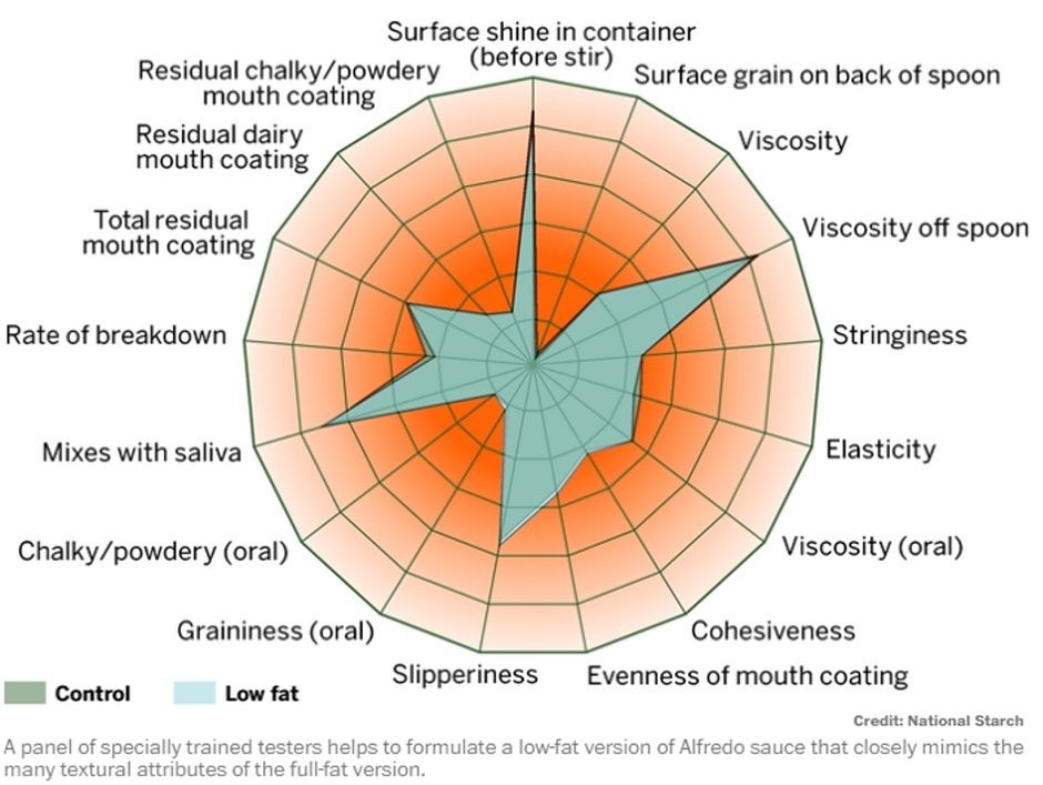 查看数据的另一种方法是在蜘蛛图或雷达图中绘制产品的所有感官特征。在这个例子中,他们说明了与全脂配方相比,他们在复制低脂配方方面有多么接近。 |