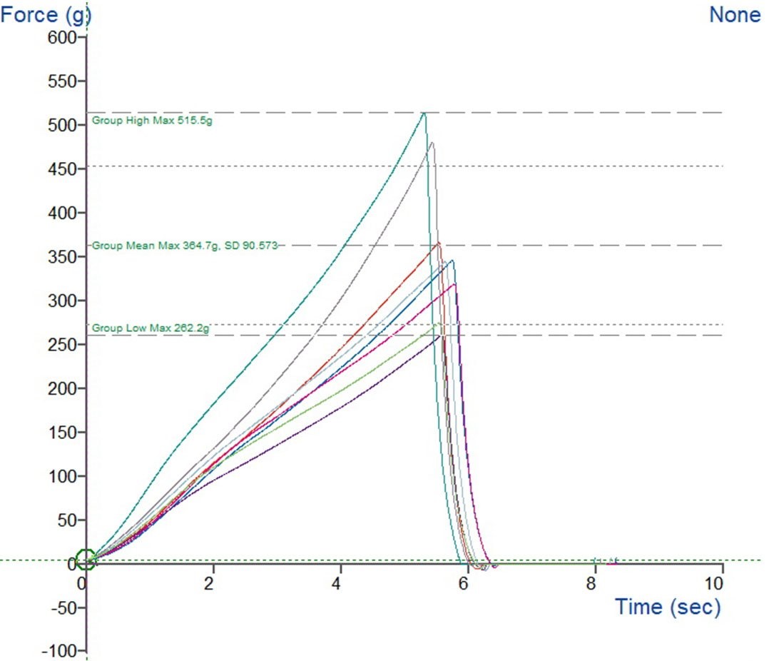 这些贴图也可以使用从质构仪获得的结果来构建,以创建产品的完整质地故事。 如何查看多个显示图形的最大值/最小值等 您是否知道 Exponent Connect 软件能够查看所显示图形范围内的最大和最小统计数据?统计数据包括所有可见图形的最高显示峰值、最低显示峰值、显示峰值的平均值和显示峰值的标准偏差。 |