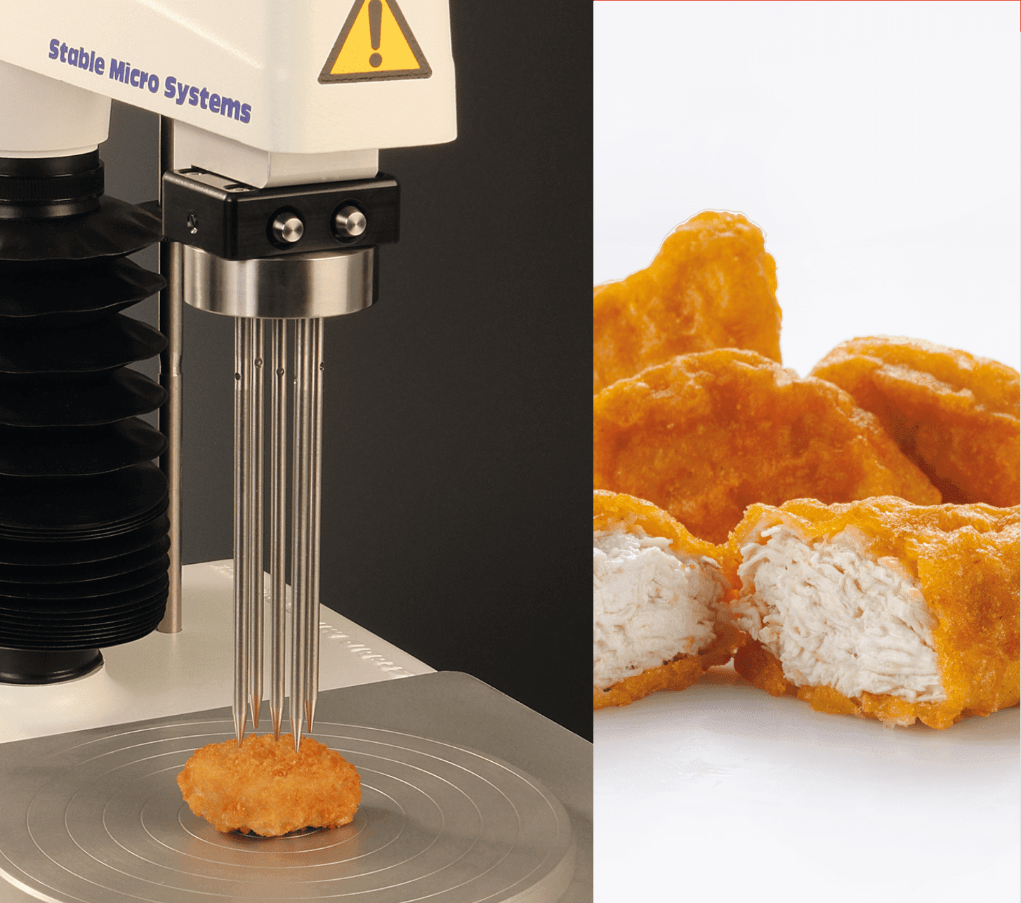 穿刺测试非常适合测量面糊产品,因为可以通过穿刺测试刺入到块体中来测量面糊层的特性。非常脆的产品可以使用接触面积较小的探针进行测试,例如 2mm穿刺探头或A/MROS刀片,也称为Volodkevich Bite Jaw。该夹具通过模拟上颌和下颌切入食物的咬合动作进行模拟测试,咬合动作由上颌剪切到测试样品中的压缩运动提供。 使用这种固定装置的最大优点是它可以模仿口腔中发生的咬合动作。但是,有两个限制:样本大小限制在 1cm2,样本需要用手指支撑,直到上颚接触到样本。 在许多情况下,多针穿刺是单次穿刺的更好替代品,因为它允许制造商测试包含不同尺寸形状、颗粒结构和硬度水平不均一的产品,以提供可重复的结果,这是由于多针穿刺的平均效应。炸鸡条是这种产品类型的一个很好的例子,因为鸡肉的形状和油炸层是不均匀的。可以移除外部针脚,以便穿刺探头覆盖所测试的样品,所有探头都安装在测试中任何给定样品的周边内。 压缩测试也经常用于测量面糊脆度,特别是在测量具有柔软、柔顺核心的样品或单独的面糊样品时。当使用较大的探针接触面积时,压缩力会放大。 |