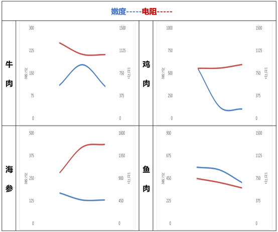 从测试结果来看,不同肉类的嫩度与电阻变化趋势存在明显差异,海参嫩度随时间下降,但由于水分损失,导电介质减少,电阻有上升趋势;鱼肉嫩度随时间下降,而不新鲜的水产会分解出胺基酸核苷酸与其他腐败小分子,导致电阻下降。