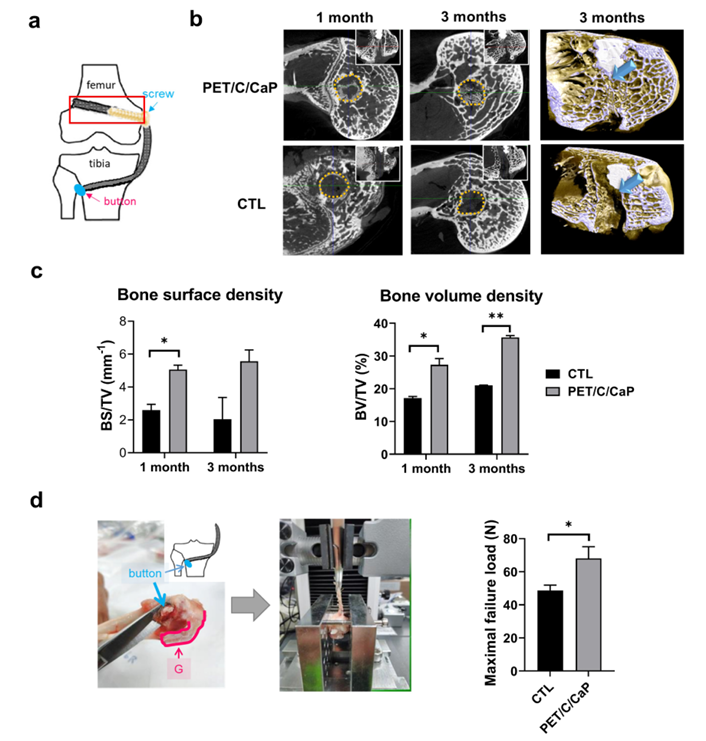 在兔子膝内侧副韧带(MCL)加固重建模型中,植入3个月后,新型 PET/C/CaP 韧带组韧带化程度高,结构接近天然韧带,纤维间隙细胞及胶原基质更丰富(图4);骨隧道内骨表面密度和体积密度显著高于对照组(LARS®)(图5b-c);移植物最大拉出失效载荷达68 N,显著高于对照组的48.67 N(图5d)。 |