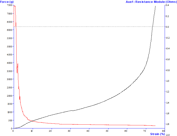 在材料受力产生应变的过程中,其内部结构发生变化,导致导电性能改变,电阻随之变化。比如,当材料受应变时,可能出现导电通路的变化(如导电粒子的接触状态改变等),从而使得电阻模量随应变呈现出这样的增长趋势,而力的变化则体现了材料在应变下的力学响应,初始的力下降可能与材料的弹性变形、内部结构的快速调整等有关,后续力趋于稳定说明材料进入某种稳定的力学状态,而电阻仍持续变化,显示出电学性能与力学应变的关联特性。