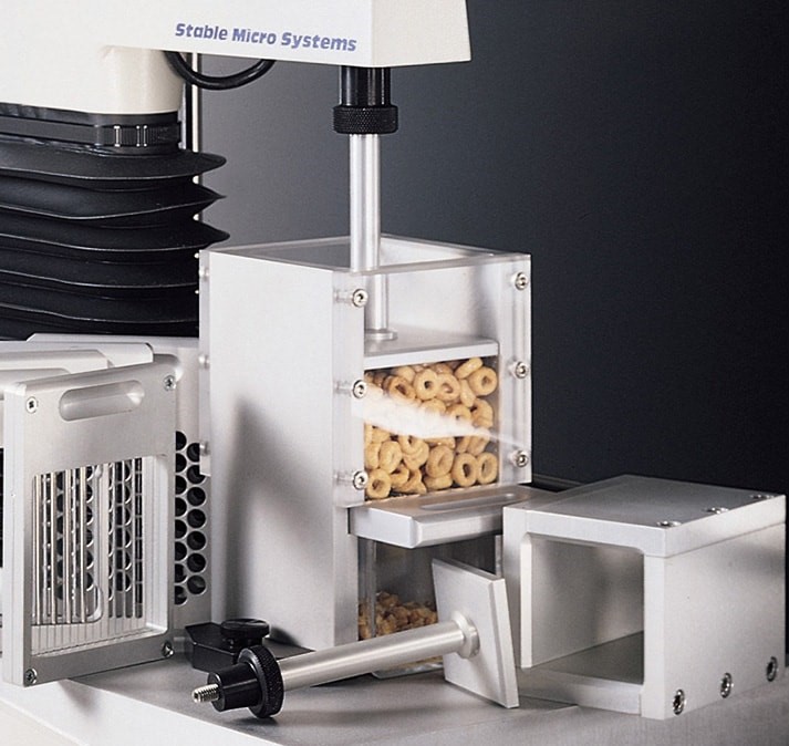 尤其引起工業興趣的是產品泡水時“脆度”的變化。穀物脆片很容易隨著時間的推移而老化,如果在液體中放置太久,就會變得濕漉漉的。固定容器批量測定 旨在為製造商提供一種測量脆度的方法,這是穀物新鮮度的一個很好的指標。 在Ottawa裝置的一個空間裡,穀物脆片被一個扁平的柱塞壓縮。這種裝置的特殊之處在於它有一個可以盛水的底座,可以將穀物浸泡在液體中,然後將液體排出,以便立即開始測試。該裝置降低了受到樣品干擾影響的可能性,以及由於樣品受擠壓偏移而導致試驗延遲的可能性。隨著壓縮的進行,可以觀察到一系列的峰值力。最大力值被視為樣品整體“硬度”的指標,線性距離被視為“脆度”的指標,線性距離值越大,產品越脆。 |