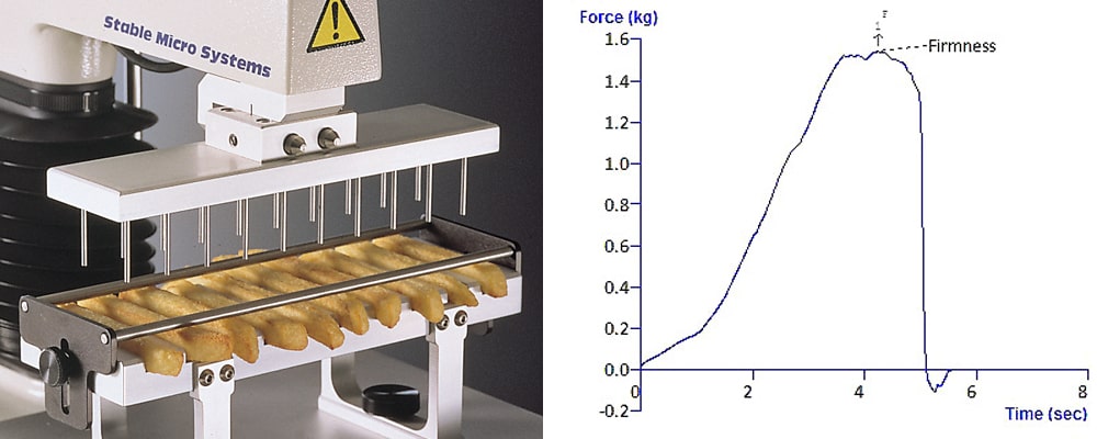 對馬鈴薯條/薯片等樣品,脆度的評估可能是最主要的特徵,並能極大地影響消費者的接受度。當樣品在Ottawa擠壓裝置中壓碎時,具有脆質的樣品產生具有多個力峰的曲線。這種類型的曲線可以使用軟體中的特殊計算功能進行分析。 |