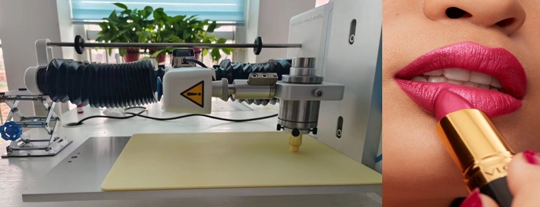 实验方法 | 在控温环境25度下平衡24小时后进行以下试验: 将唇膏转出固定长度,垂直90度接触人工皮,施压80g砝码后进行拖动涂抹,测试唇膏的涂抹特性。 |