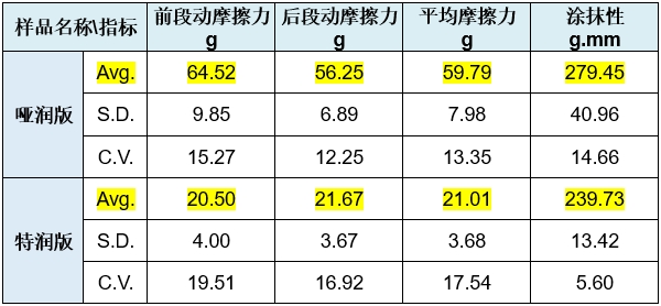 试验结论 | 本次实验评估唇膏质地特性,产品定位不同会有不同的配方比,在质地的表现上会有所变化。 结果显示特润<哑润,特润的摩擦与涂抹表现明显优于哑润,或许与唇膏的油份比例有关,感官评测也表示特润涂抹性最佳。 |