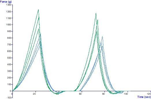 使用全质构分析(TPA)得到硬度、回复性、内聚、咀嚼性以及蓬松度(Fluffiness)。 | |