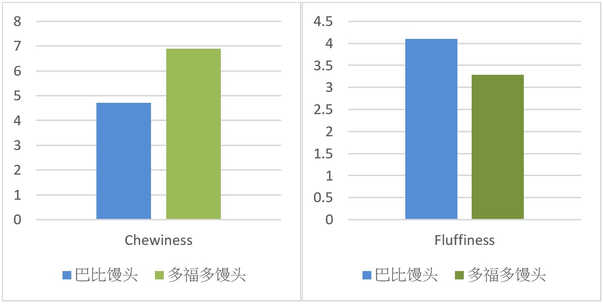 实验结论 | 馒头质地有明显差异,硬度、咀嚼性都是多福多大于巴比馒头;而在回复性则为巴比优于多福多,此结果不仅仅反映南北馒头实际口感差异,也说明孔隙数量及占比也可能会影响回弹能力。 | |