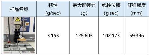 n    韧性样品用 A/ATG 铰接式夹具做撕裂测试,评估撕拉体验与纤维强度最大撕裂力表明该样品需一定力度撕拉,适合追求纤维撕扯感的植物肉产品。
