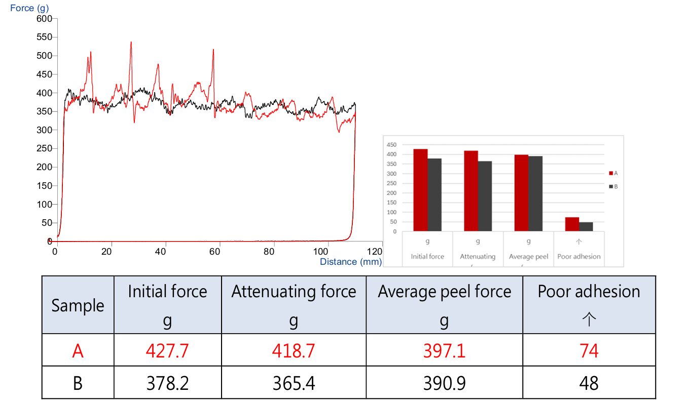 通过测试可以看到虽然样品A、B平均剥离力相近,但两者特性却大不相同——
