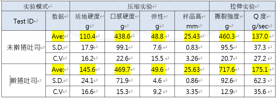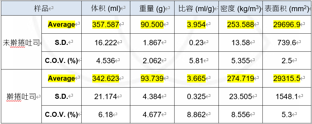 实验结论 | 在切片测试中未擀捲过的吐司数值皆低于擀捲的吐司,经过擀捲的吐司其硬度及弹性会变大。结合体积测定仪我们可以看到,同样大小的吐司经过擀捲后其体积会变小,而重量以及密度会随之变大。由此我们可以得知吐司经过擀捲后因其体检变小内部密度变大,使其硬度及弹性随之变大,从而增加了吐司的口感。 | |