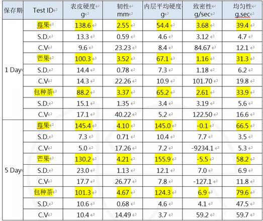 目的 | 测试三种口味玛德莲分别放置第一天及第五天的质地,进而评估其质地差异。 | |